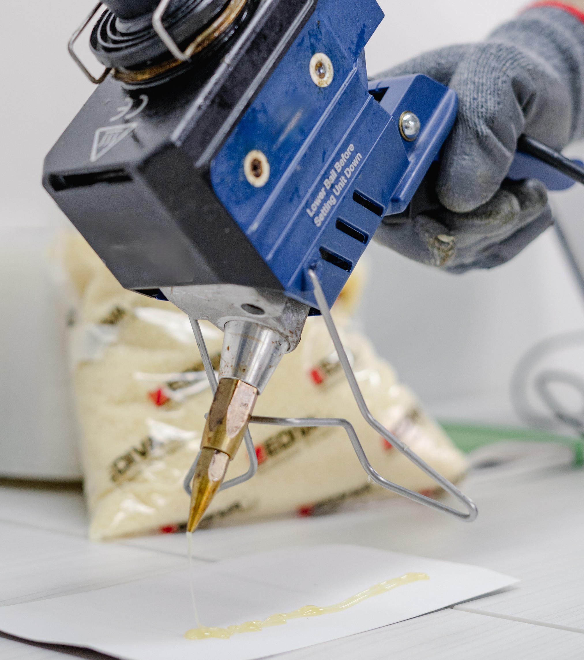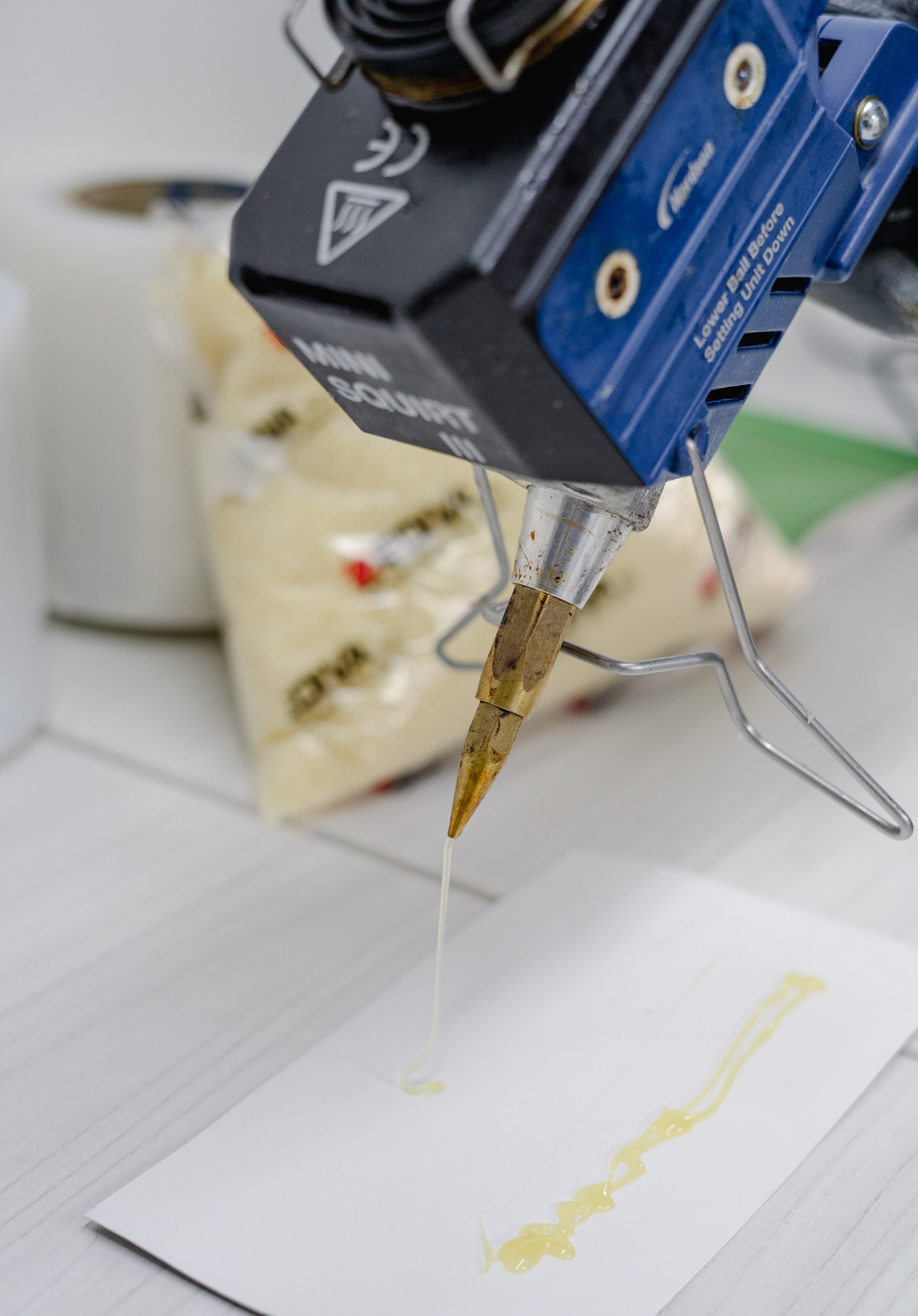 También conocido como Adhesivo Termofusible, es un tipo de pegamento que se aplica al fundirse con calor. Al enfriarse forma una unión fuerte entre elementos. No contiene solventes ni genera vapores, lo que hace un material ecológico y apto para la salud de quien lo manipula. Su aplicación es rápida y eficiente, lo que reduce tiempos en producción y alistamiento de mercancía.
